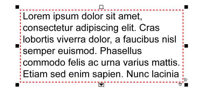 Sie können das Hilfsmittel Auswahl zum Anpassen der Größe von Mengentextrahmen verwenden. Klicken Sie den Textrahmen an und ziehen Sie einen Auswahlbearbeitungspunkt.