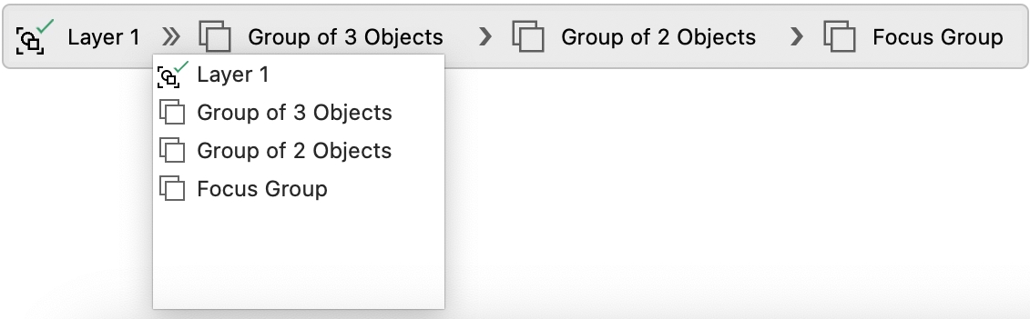 When you activate Focus mode, a floating toolbar appears in the top-left corner of the drawing window displaying the focused object’s place in the hierarchy of the design. Using the breadcrumb controls on the floating toolbar, you can shift focus to other parts of the design without opening the Objects inspector.