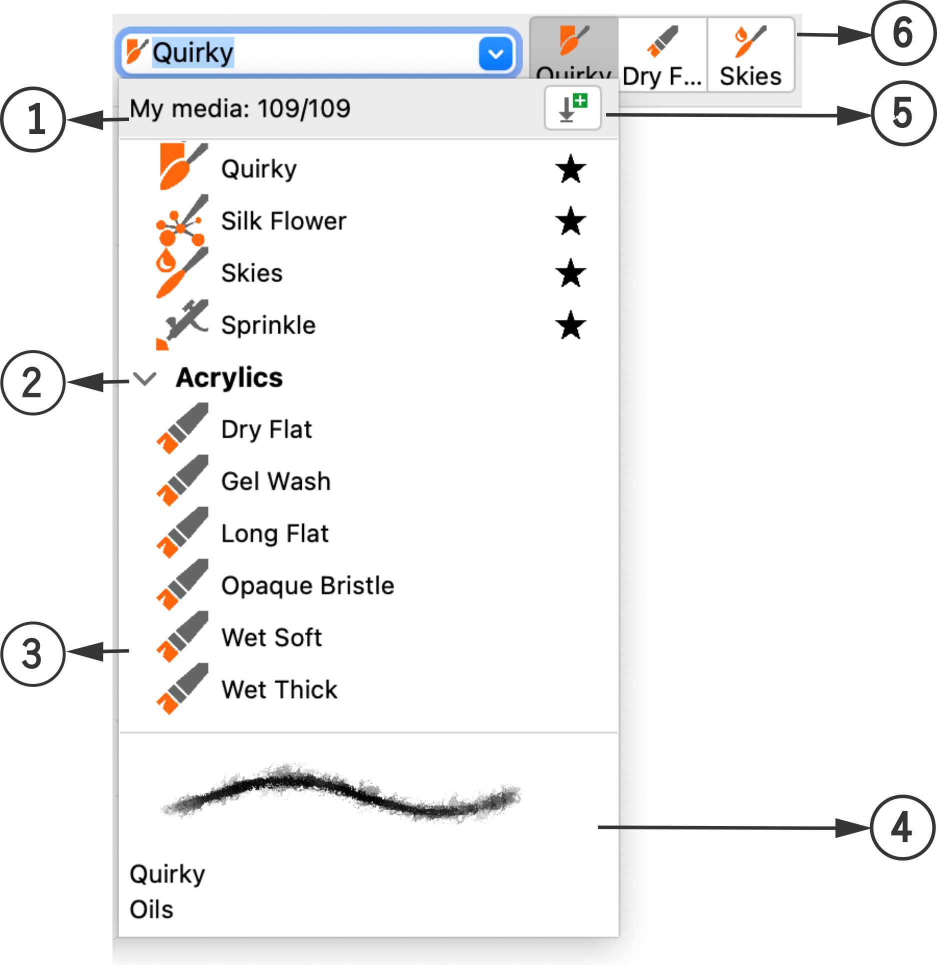 You can search for brush styles or brush categories from within the Brush picker. When you start typing a brush name, a list of brushes that match the search term is displayed. This list is automatically updated as you type. You can access the three most-recently used brush styles in the media tray to the right of the Brush picker.