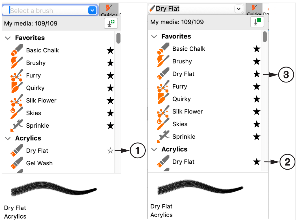 The selected brush (1) is marked as a favorite (2) and added to the Favorites category (3).