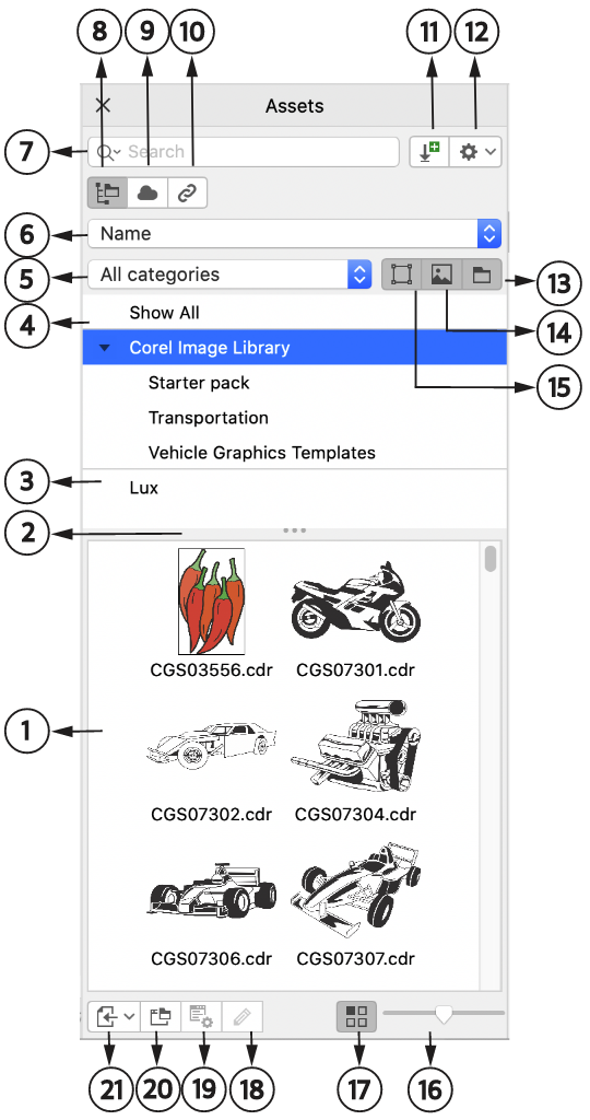 Assets) provides a central location where you can search and browse vector and bitmap images in local or network folders and on portable devices.