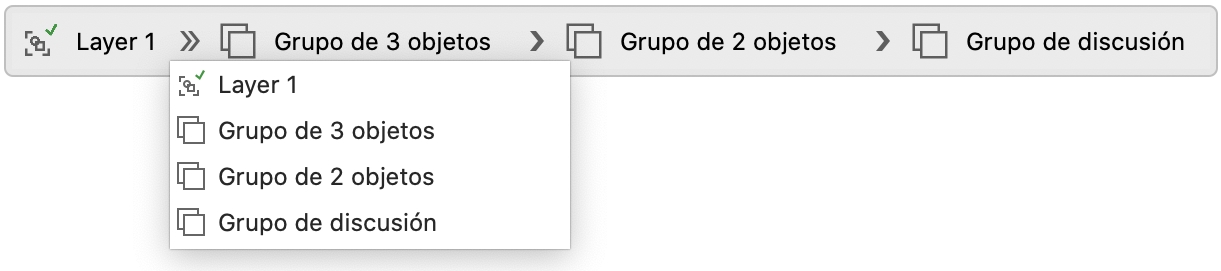Al activar el modo Enfoque, aparece una barra de herramientas flotante en la esquina superior izquierda de la ventana de dibujo que muestra el lugar del objeto enfocado en la jerarquía del diseño. Mediante los controles de la ruta de navegación de la barra de herramientas flotante, puede cambiar el enfoque a otras partes del diseño sin abrir el inspector Objetos.