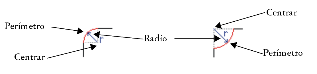 Observe cómo se mide el radio de una esquina redondeada (izquierda) y el de una esquina festoneada (derecha).