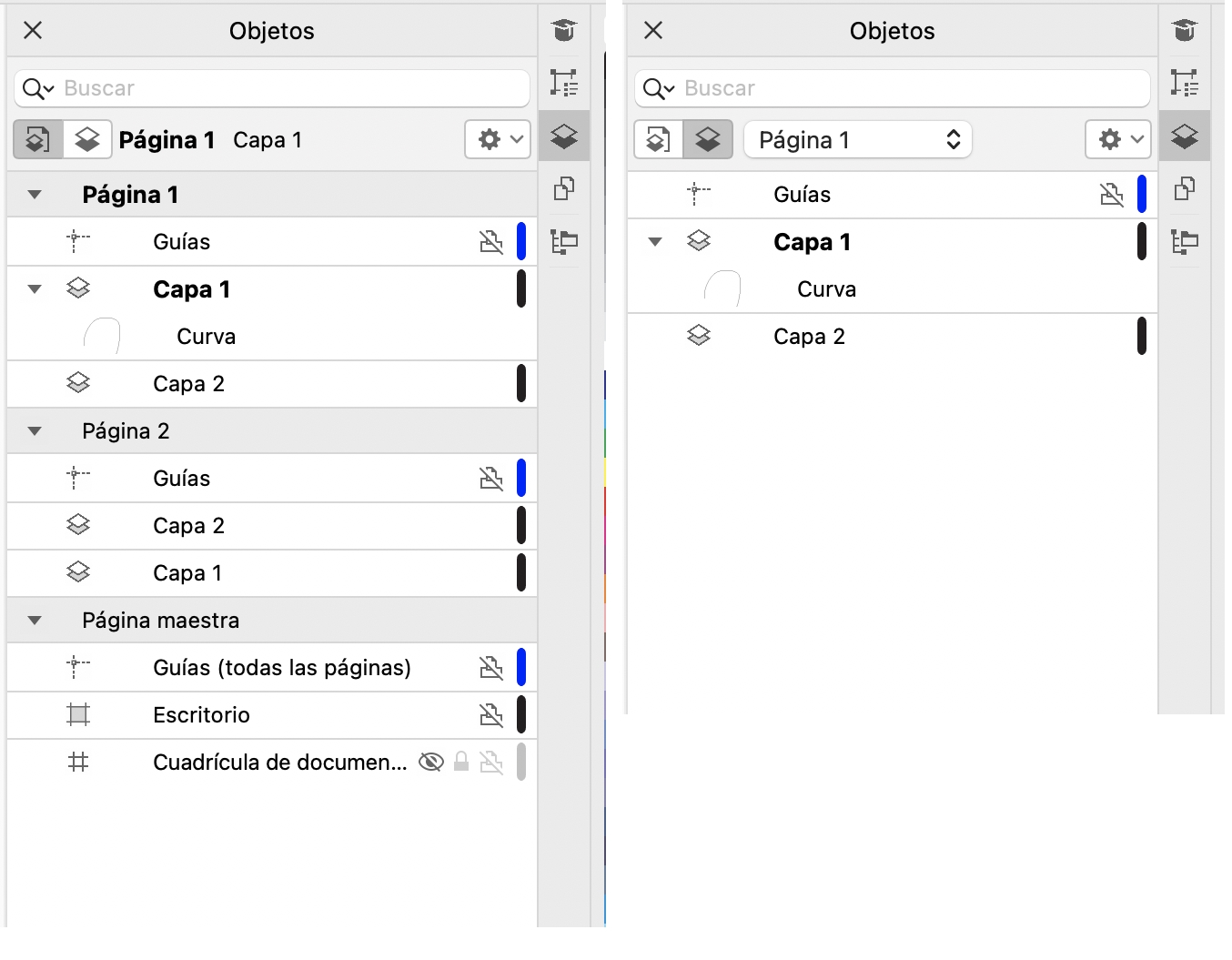 Visualizaciones disponibles: Páginas, capas y objetos (izquierda); Capas y objetos (derecha)