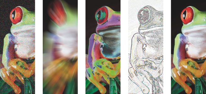 Umożliwia modyfikowanie ziarnistości obrazka. Efekty obejmują Strojenie szumu, Dodaj szum, Stereogram, Maksimum, Mediana, Minimum, Usuń morę i Usuń szum
