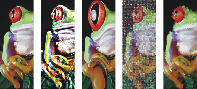 Przykłady efektów map bitowych zastosowanych do obiektu mapy bitowej. Góra (od lewej do prawej) Oryginalny obraz, efekt Płaskorzeźba, efekt artystyczny Kubizm, efekt kreatywny Mozaika, efekt ziarnistości Zniekształcenie; Dół (od lewej do prawej): efekt Dodaj szum, efekt rozmycia Powiększenie, efektu transformacji kolorów Solaryzacja, efekt obrysu Wykrywanie krawędzi, efekt Wyostrzanie