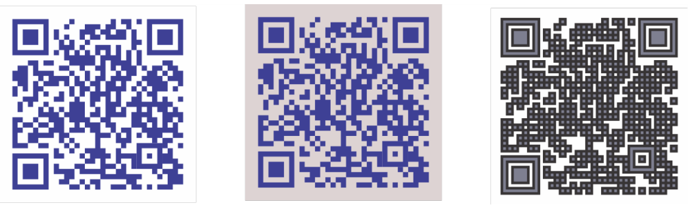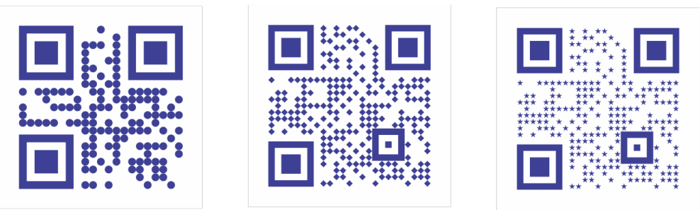 Od lewej do prawej: Kody QR z pikselami w kształcie koła, rombu i gwiazdy.