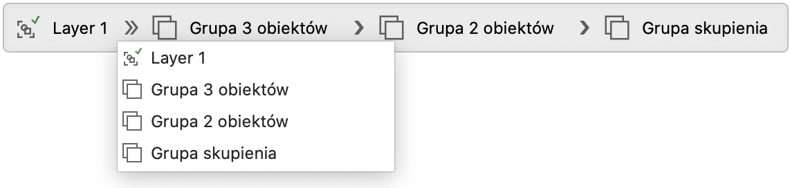 Wybrana grupa obiektów (po lewej), obiekt w obrębie wybranej grupy obiektów (po środku) i obiekt w obrębie grupy obiektów w trybie skupienia (po prawej).