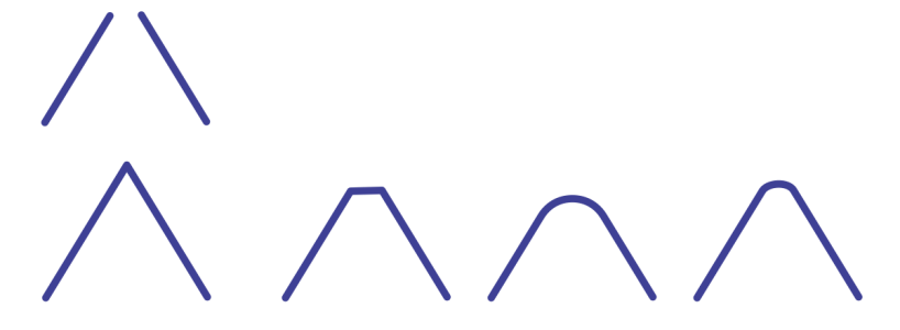 Linie w lewym górnym rogu zostały połączone przy użyciu innych trybów. Tryby od lewej do prawej: Rozciągnięcie, Ścięcie, Zaokrąglenie i Krzywa Béziera.