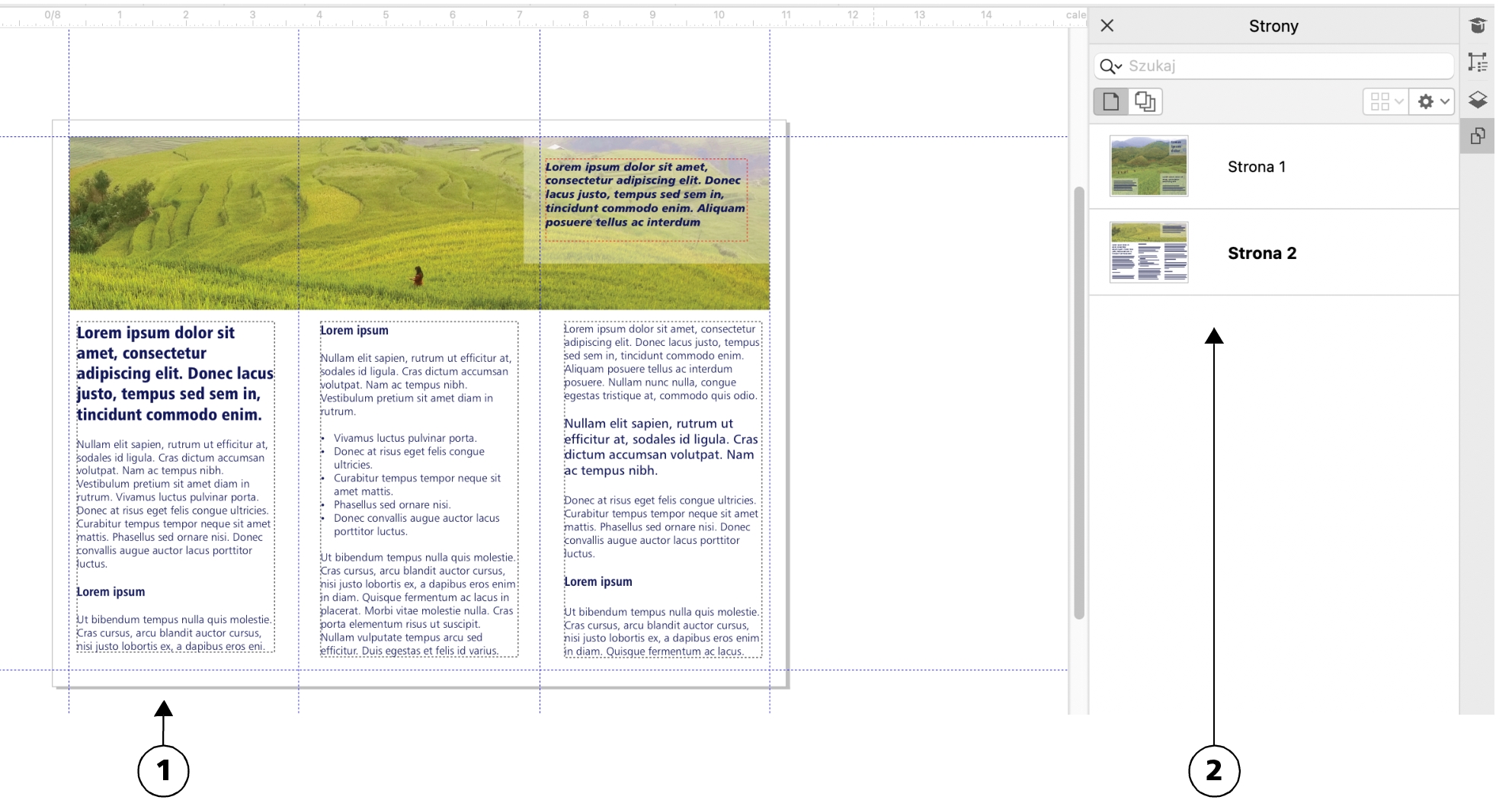 W widoku pojedynczej strony wyświetlana jest tylko jedna strona. Aby poruszać się między stronami, należy kliknąć odpowiednią kartę strony (1) na pasku nawigacyjnym lub nazwę strony (2) w inspektorze Strony.