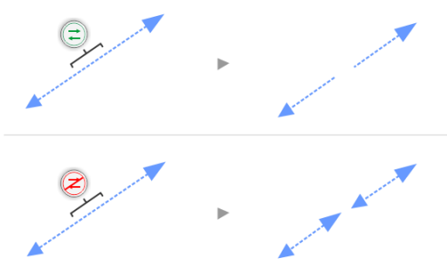U góry: Kontur (w tym przykładzie linia przerywana ze strzałkami) został po podziale przekształcony w obiekty, co pozwoliło zachować jego początkowy wygląd. U dołu: Po zastosowaniu opcji Zachowaj kontury powstały dwie linie ze strzałkami na obu końcach.