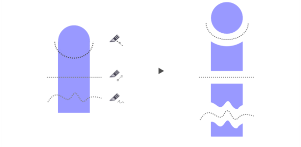 Podczas dzielenia obiektów zawierających linie przerywane, strzałki lub zakończenia linii, funkcja Przekształć w obiekty pozwala lepiej zachować wygląd konturu. Po wybraniu opcji Automatycznie program CorelDRAW przekształci kontury w obiekty.