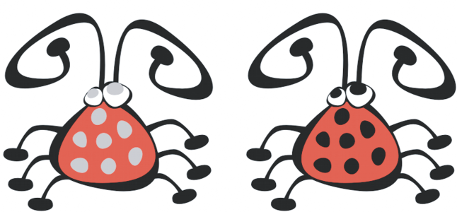 Przez przycinanie można zmniejszyć liczbę obiektów na rysunku. Zamiast dodawać biedronce oczy i kropki, wystarczy przyciąć pewne obszary (oznaczone po lewej szarym kolorem), aby ukazało się czarne tło (po prawej).