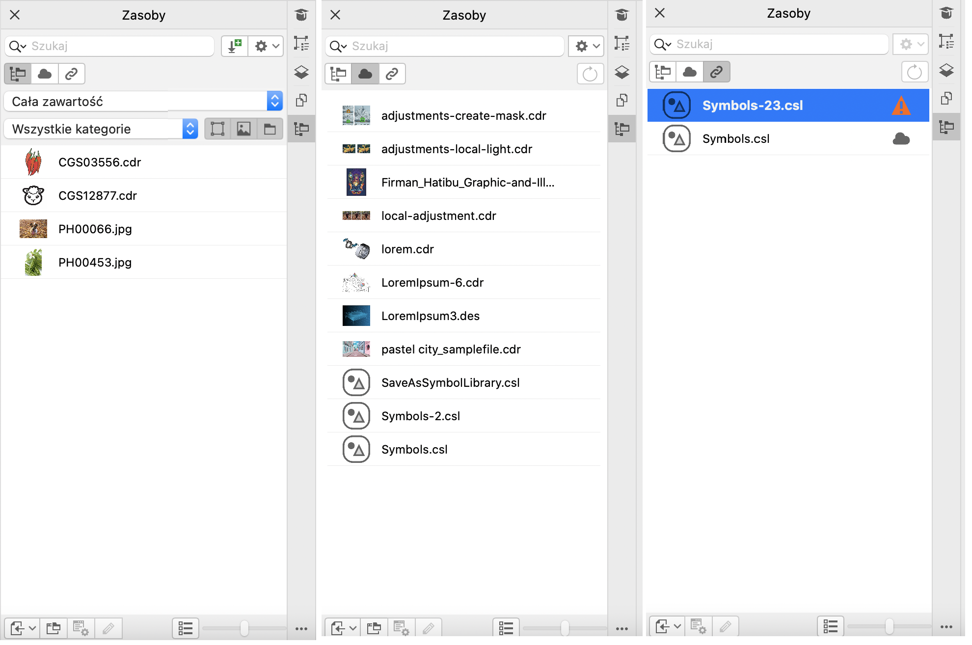 Inspektor zasobów zapewnia trzy widoki umożliwiające pracę nad zawartością. Widok Zasoby lokalne i sieciowe pokazuje obrazy wektorowe i bitmapowe oraz inne zasoby przechowywane w folderach lokalnych lub sieciowych. Widok Zasoby z chmury pokazuje pliki znajdujące się w folderze chmury, w tym udostępnione pliki z biblioteki symboli. Widok Połączone zasoby pokazuje biblioteki symboli połączone z aktywnym dokumentem.