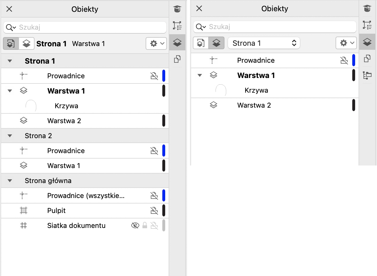 Dostępne widoki: Strony, Warstwy i Obiekty (po lewej); Warstwy i Obiekty (po prawej)