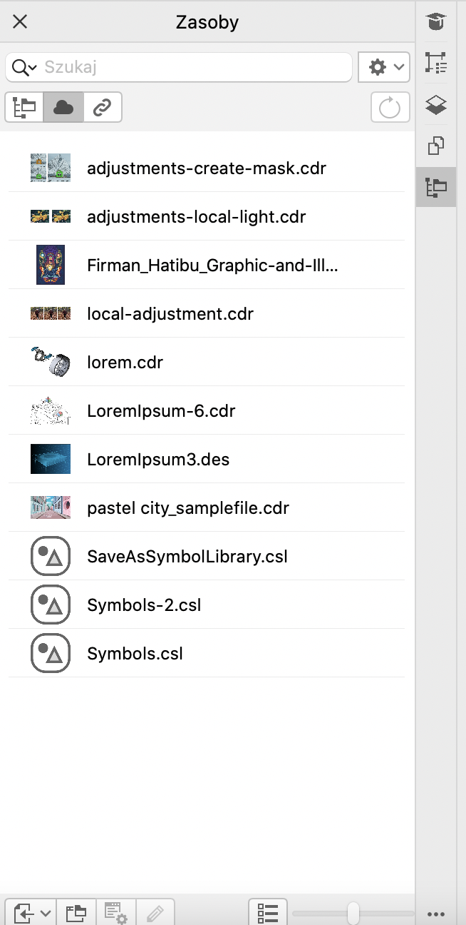 Inspektor Zasoby umożliwia przeglądanie i wyszukiwanie wszystkich zasobów z chmury, takich jak pliki CorelDRAW (CDR), pliki Corel DESIGNER (DES) i biblioteki symboli, w tym bibliotek symboli udostępnione w folderze chmury. Po znalezieniu zasobu z chmury można go dodać do aktywnego dokumentu w taki sam sposób jak w przypadku dodawania dowolnego zasobu z folderu lokalnego lub sieciowego. Więcej informacji można znaleźć w sekcji Aby wstawić treść do aktywnego dokumentu.