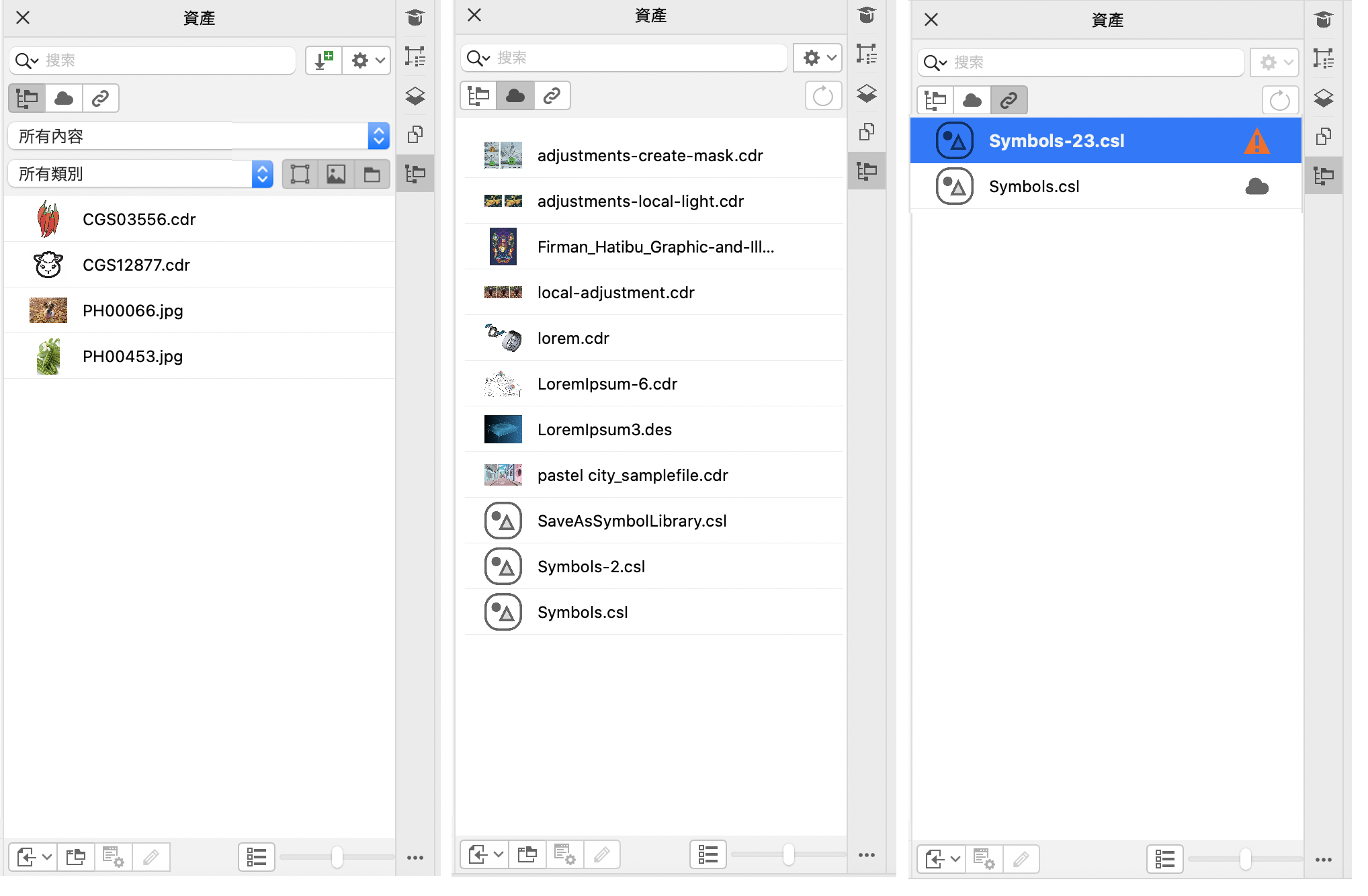 资产检查器提供三种视图来帮助您处理内容。本地和网络资产视图显示存储在本地或网络文件夹中的矢量和位图图像以及其他资产。云资产视图显示云文件夹中的文件,其中包括与您共享的符号库文件。链接的资产视图显示链接到活动文档的符号库。