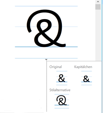 nicht ausgewählt ist. Klicken Sie zum Anzeigen aller Glyphen in einer Gruppe auf ein Zeichen und anschließend auf den Bildschirmindikator für die OpenType-Funktion. Klicken Sie auf eine Glyphe, um sie in der Zeichen- und Glyphenliste anzuzeigen.