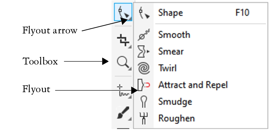 The toolbox contains tools for drawing and editing images. Some of the tools are visible by default, while others are grouped in flyouts. Flyouts open to display a set of related CorelDRAW tools. A small flyout arrow in the lower-right corner of a toolbox button indicates a flyout. You can access the tools in a flyout by clicking the flyout arrow. After you open a flyout, you can easily scan the contents of other flyouts by hovering over any of the toolbox buttons which have flyout arrows.