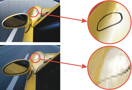 Top: A vector graphic consists of lines and fills. Bottom: A bitmap is made up of pixels.