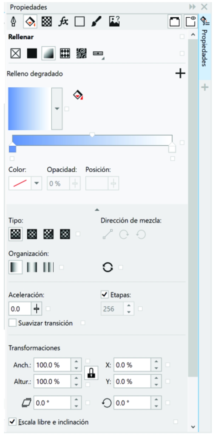 Es posible modificar cualquier relleno degradado para que se ajuste a sus necesidades; además, puede crear los suyos propios desde cero. Los rellenos degradados personalizados pueden contener dos o más colores, que se pueden situar en cualquier lugar de la progresión del relleno. Asimismo, es posible especificar los atributos de relleno, como la dirección de su mezcla de color, su ángulo, así como los puntos central y medio. Además, puede establecer la anchura y altura del relleno como un porcentaje de la anchura y la altura del objeto Además, puede suavizar, inclinar, girar, repetir y reflejar un relleno.