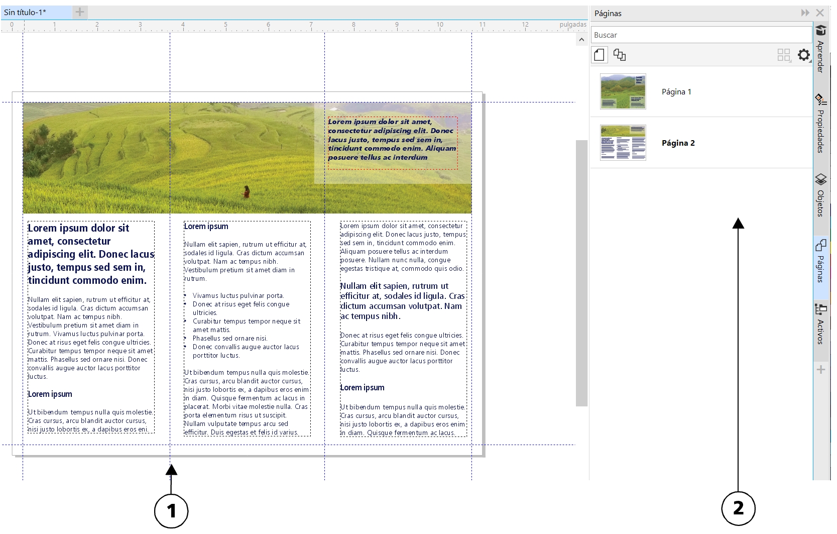 En la vista de una sola página, solo se muestra una página a la vez; para navegar entre las páginas, haga clic en la pestaña de la página correspondiente (1) en el explorador de documentos o en el nombre de la página (2) en la ventana acoplable Páginas.