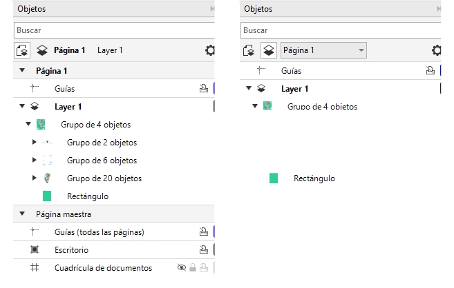 Visualizaciones disponibles: Páginas, capas y objetos (izquierda); Capas y objetos (derecha)