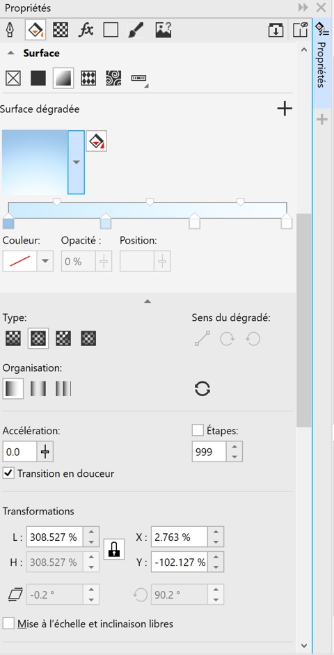Vous pouvez modifier les surfaces dégradées en fonction de vos besoins et créer vos propres surfaces. Les surfaces dégradées peuvent contenir deux couleurs ou plus, qui peuvent être placées n’importe où dans la progression des couleurs. Vous pouvez définir les attributs de la surface tels que la direction des dégradés de couleurs, l’angle, le point central et le milieu de la surface. Vous pouvez également définir la largeur et la hauteur de la surface sous forme de pourcentage de celles de l’objet. De plus, vous pouvez lisser, incliner, faire pivoter, répéter et appliquer une symétrie à une surface.