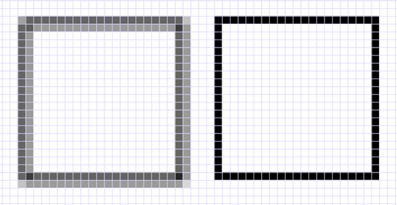 La visualizzazione in pixel di un quadrato (sinistra) con uno spessore di linea di 1 pixel creato senza il suggerimento relativo all'oggetto. Una copia del quadrato (destra) con il suggerimento relativo all'oggetto applicato.