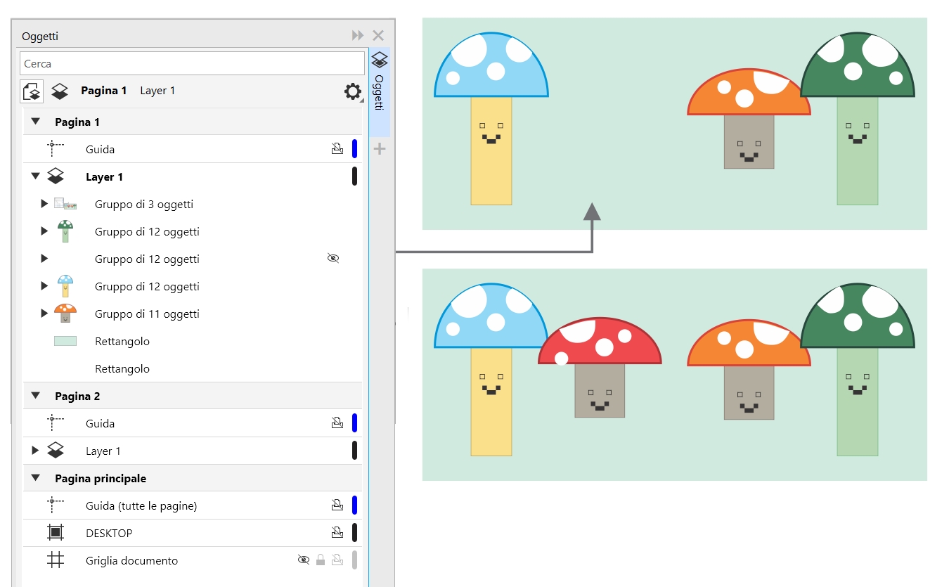 CorelDRAW consente di nascondere oggetti e gruppi di oggetti per modificarli all'interno di progetti complessi e facilitare le operazioni nei disegni.