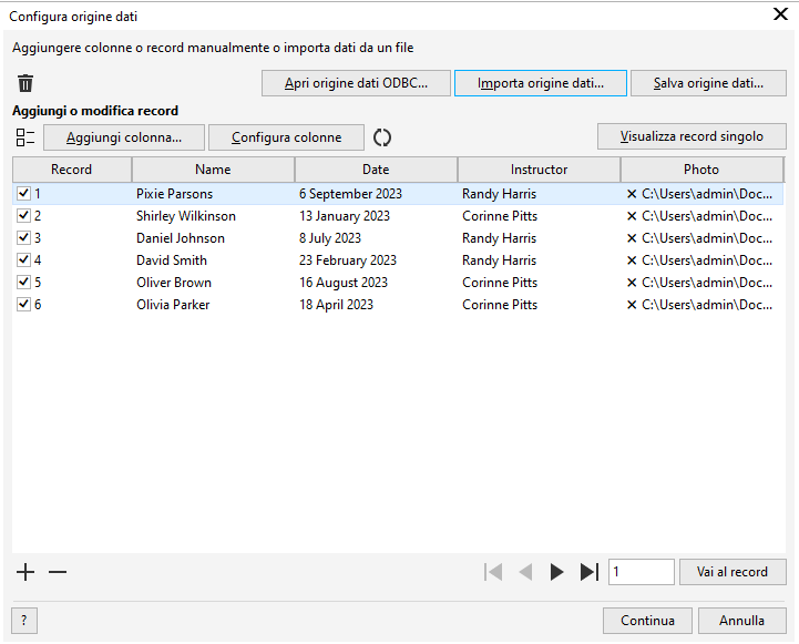 È possibile creare un'origine dati oppure importarne una esistente. CorelDRAW supporta i seguenti file di origine dati: File di testo (TXT), file CSV (valori separati da virgola), file RTF (Rich Text Format), file XLSX (Excel Workbook)e file che possono essere aperti tramite un'origine dati ODBC.