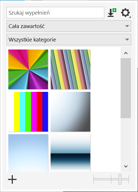 Aby ułatwić rozpoczęcie pracy, program Corel zapewnia lokalne wypełnienia dostępne na liście Cala zawartość w selektorach Wypełnienie i Przezroczystość. Wypełnienia te są zapisane w folderze Dokumenty\Corel\Corel Content\Wypełnienia. Jeśli chcesz rozszerzyć swoją kolekcję wypełnień, możesz pobrać dodatkowe pakiety wypełnień w oknie dialogowym Pobierz więcej.