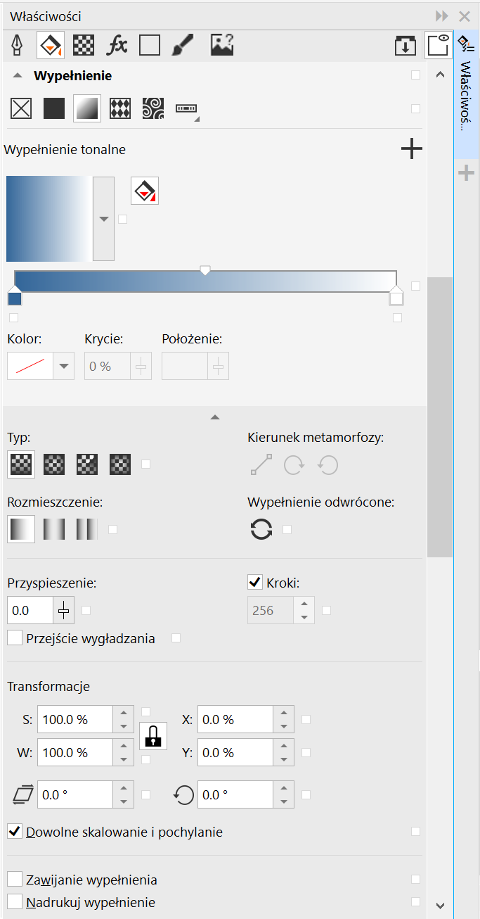 Właściwości wypełnień można edytować przy użyciu okna dokowanego Właściwości.