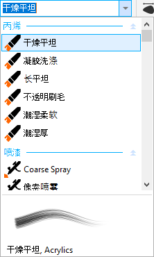 将鼠标悬停在笔刷选择器中的样式上会显示笔触特征的预览,例如形状、底纹和透明度。