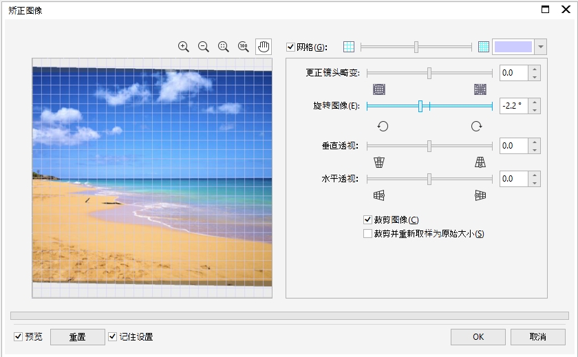 预览窗口中将显示网格以帮助您矫正图像。通过控制网格的单元格大小可以进行更加精确的调整。要增强网格相对于图像颜色的对比度,可以更改网格的颜色。如果想预览不带网格线的最终结果,也可以隐藏该网格。另外,您可以在预览窗口中缩放和平移图像以评估结果。