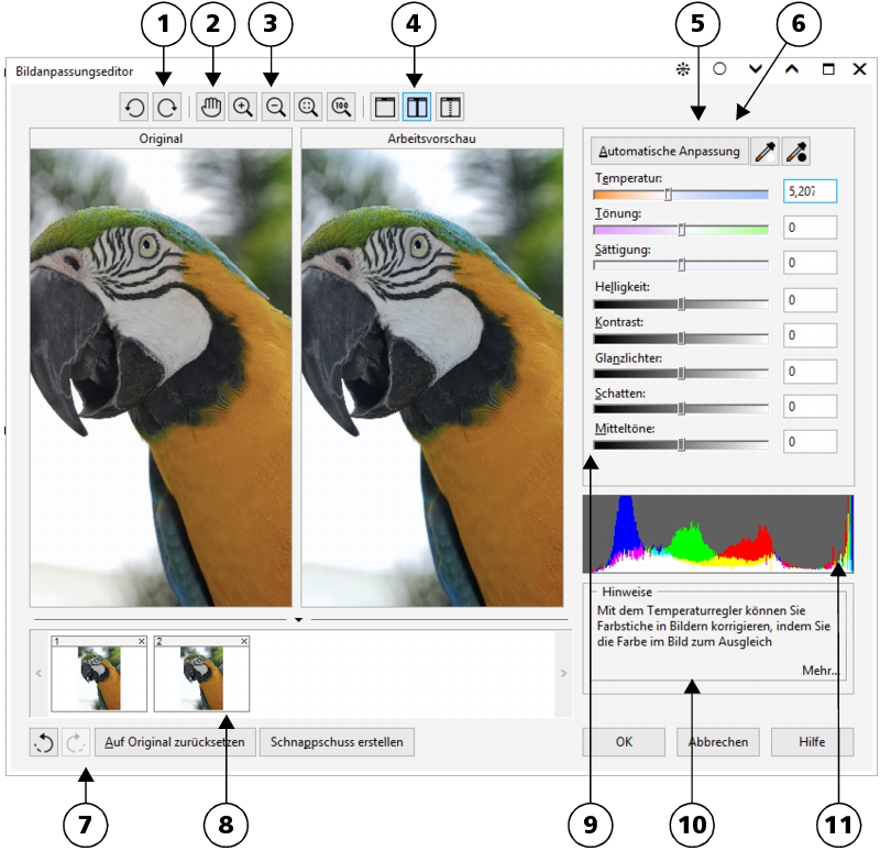 Bei der Arbeit im Bildanpassungseditor können Sie folgende Funktionen nutzen: