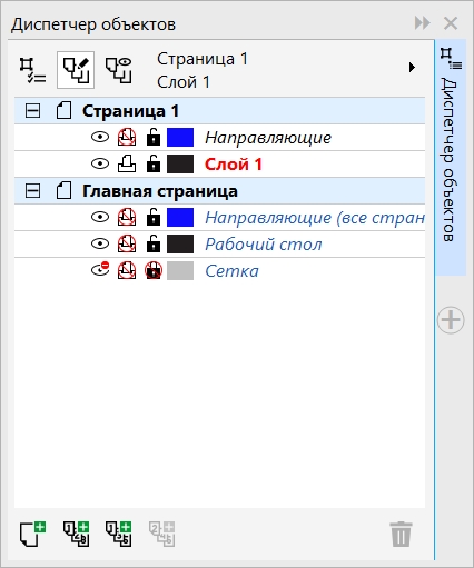 В окне настройки Диспетчер объектов отображается структура слоев, заданная по умолчанию. Имена активной страницы и слоя отображаются вверху.