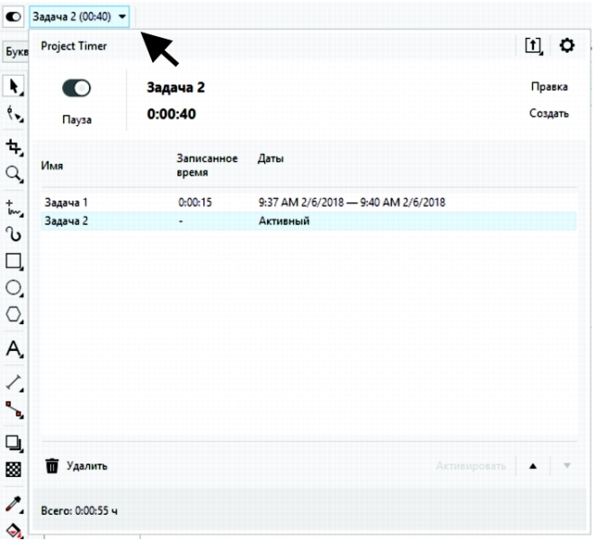 Стрелка на панели инструментов «Таймер проекта» служит для того, чтобы показать или скрыть дополнительную панель, где можно добавлять и редактировать задачи, а также получать доступ к разным параметрам.
