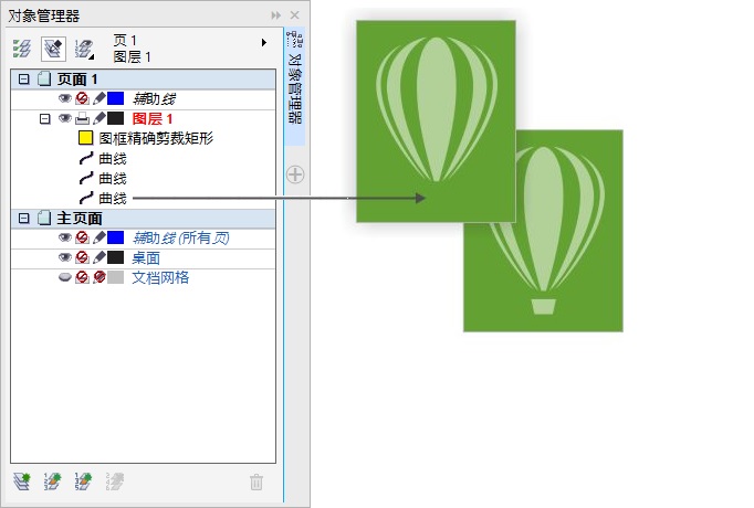 隐藏对象后,对象名称会在对象管理器泊坞窗中灰显,并且名称旁边会显示一个图标。