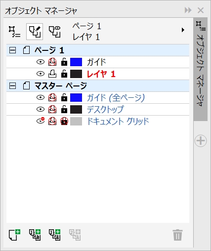 [オブジェクト マネージャ]ドッキング ウィンドウは、デフォルトのレイヤ構造を表示します。アクティブなページおよびレイヤの名前が一番上に表示されます。