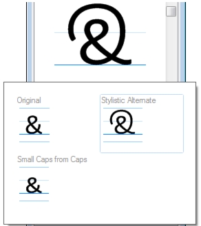 OpenType 機能によって提供されている一部のグリフは、表示されるコンテキストにより異なり、[文字の挿入] ドッキング ウィンドウで表示できません。OpenType 機能の画面上のインジケータを使用して、このようなグリフをドキュメント ウィンドウに表示したり挿入できます。詳しくは、画面上の OpenType 機能インジケータを有効にするには.を参照してください。