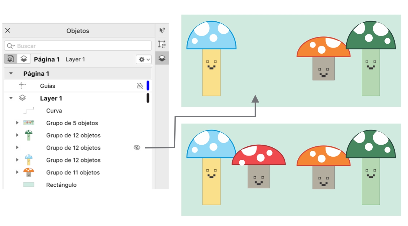 CorelDRAW permite ocultar objetos y grupos de objetos para facilitar la edición de objetos en proyectos complejos y experimentar con los diseños más fácilmente.