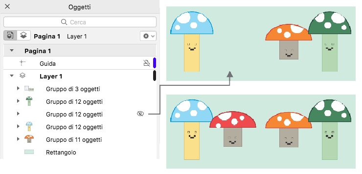 CorelDRAW consente di nascondere oggetti e gruppi di oggetti per modificarli all'interno di progetti complessi e facilitare le operazioni nei disegni.