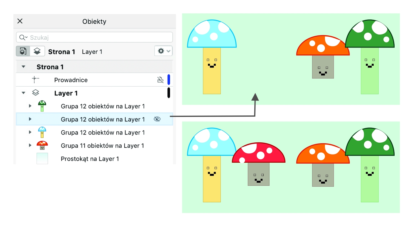Program CorelDRAW umożliwia ukrywanie obiektów i ich grup, ułatwiając w ten sposób edycję obiektów w skomplikowanych projektach oraz eksperymentowanie z tworzoną grafiką.