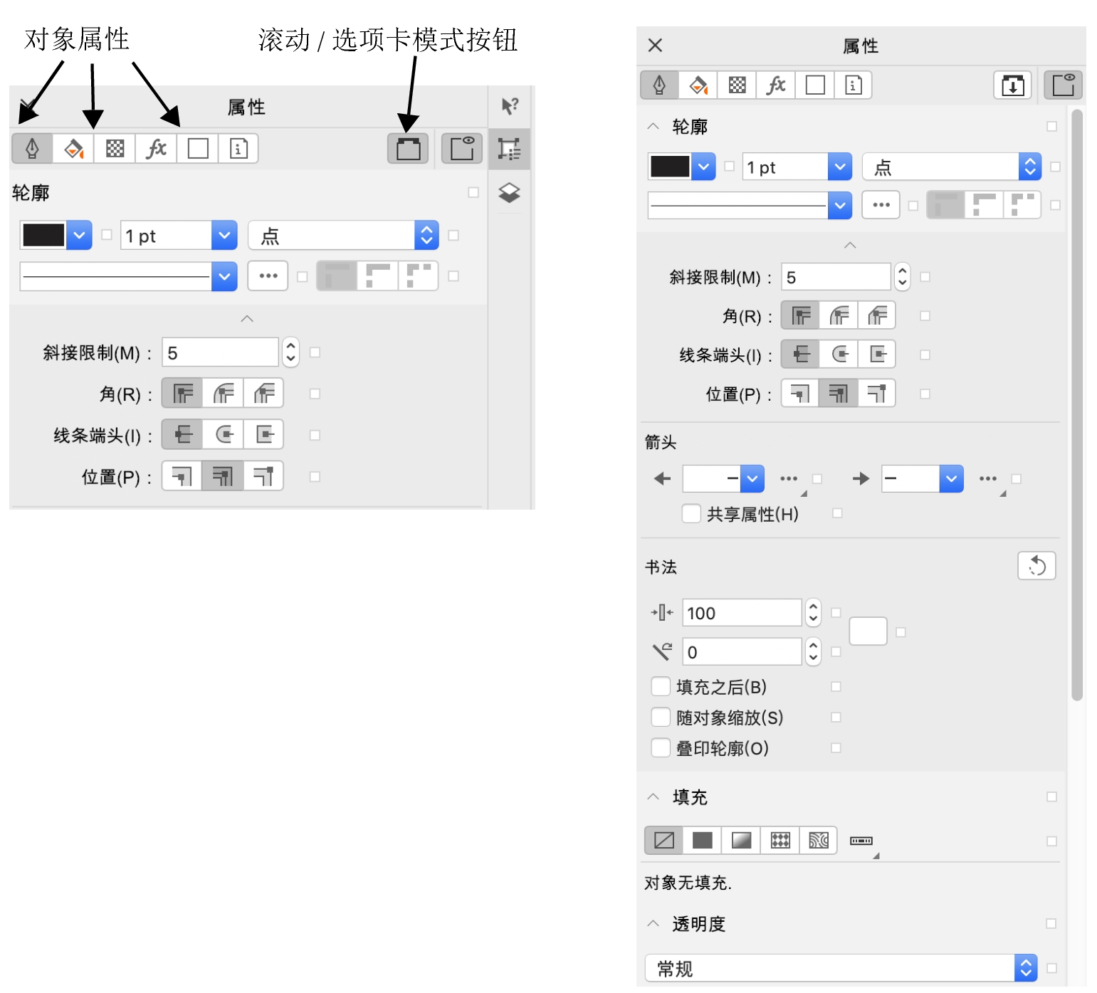您可以使用属性检查器顶部的控件来快速浏览至要修改的属性。此外,还有两种查看模式可用:滚动和选项卡滚动模式显示所有相关对象属性,使您可以滚动到您需要的选项。选项卡模式一次仅显示一组对象属性,同时隐藏其他选项。例如,您可以只查看填充选项,然后单击轮廓按钮只查看轮廓选项。