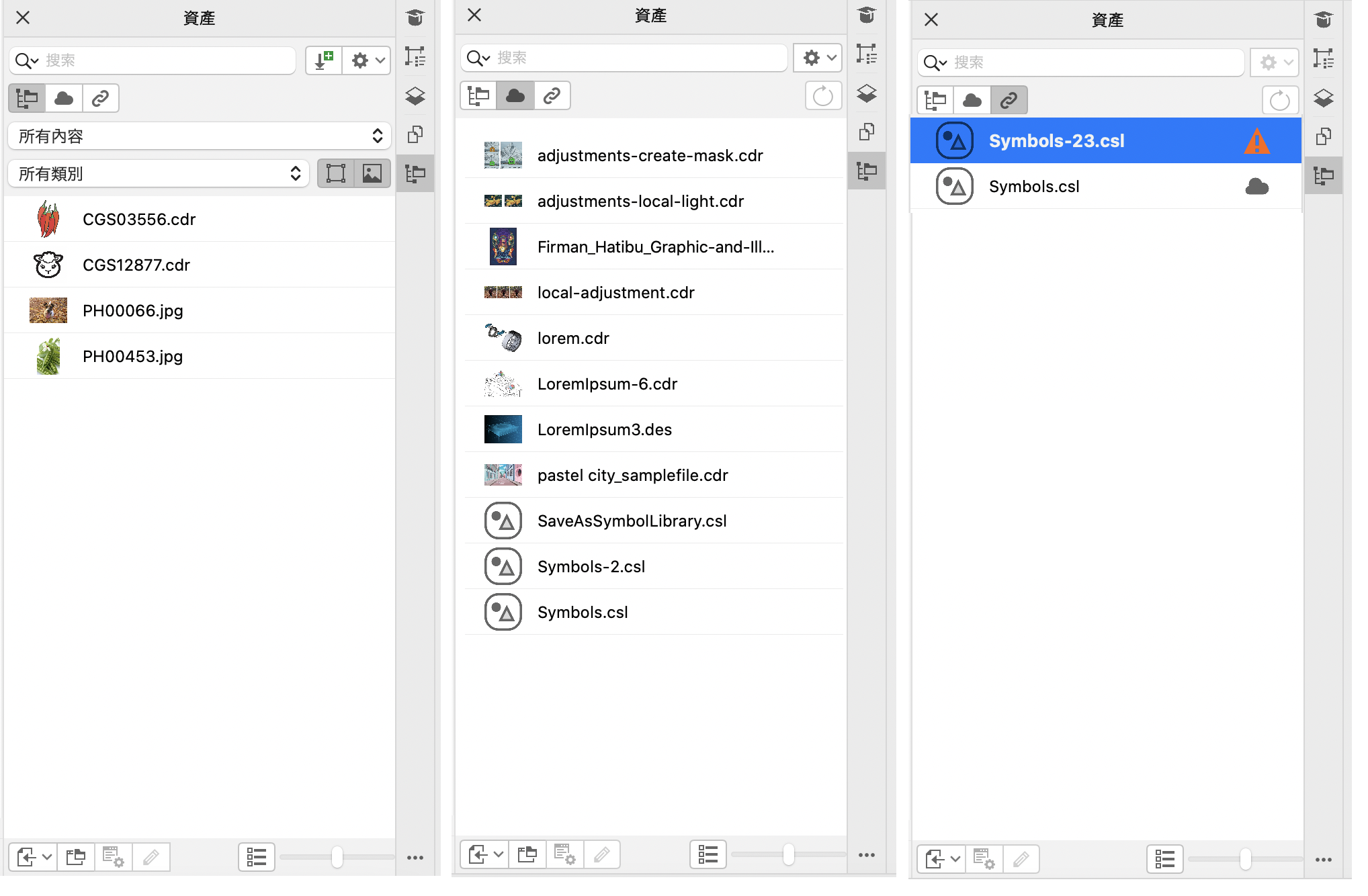 从 CorelDRAW 中的资产检查器(以前称为"CONNECT 内容"检查器)访问所有本地、共享和云端内容。通过重命名的并经过增强的资产检查器,您可以快速访问保存和共享到云文件夹的所有符号库和其他文件。此外,您还可以查看所链接的符号库,并可以将其与来源(无论是本地还是在线)同步,以便它们的符号始终保持最新。