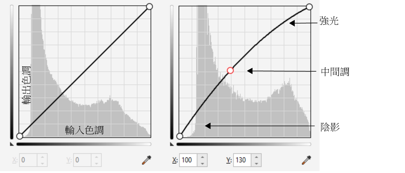 色調曲線顯示了影像的陰影、中間調與強光之間的平衡關係。(左) 色調調整前的影像色調曲線。(右) 此範例顯示了對色調範圍的一個小調整,此範例將像素值 100 取代為像素值 130 以使中間調區變亮。