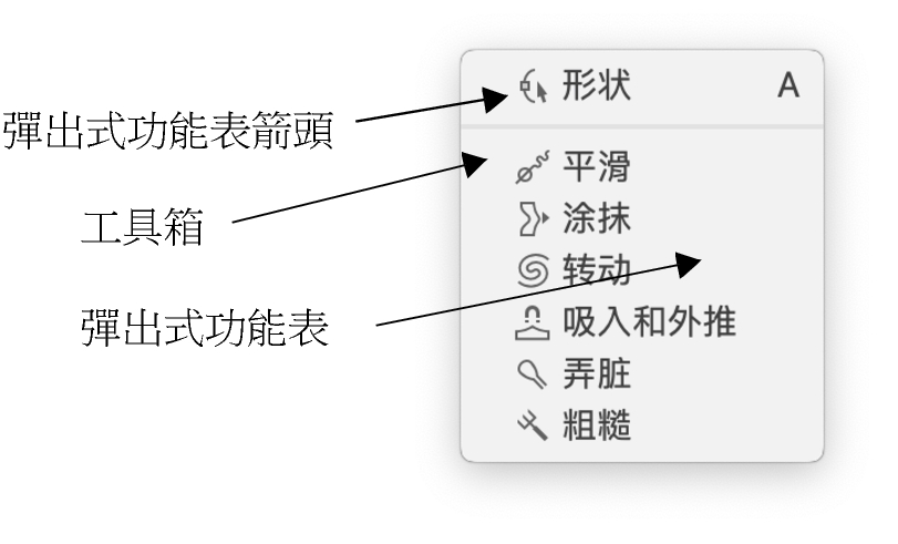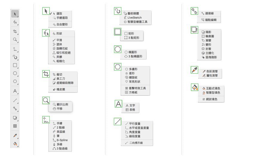 以下的插圖顯示在預設的 CorelDRAW 工具箱中所有的彈出式功能表,能協助您更輕易地找出工具。