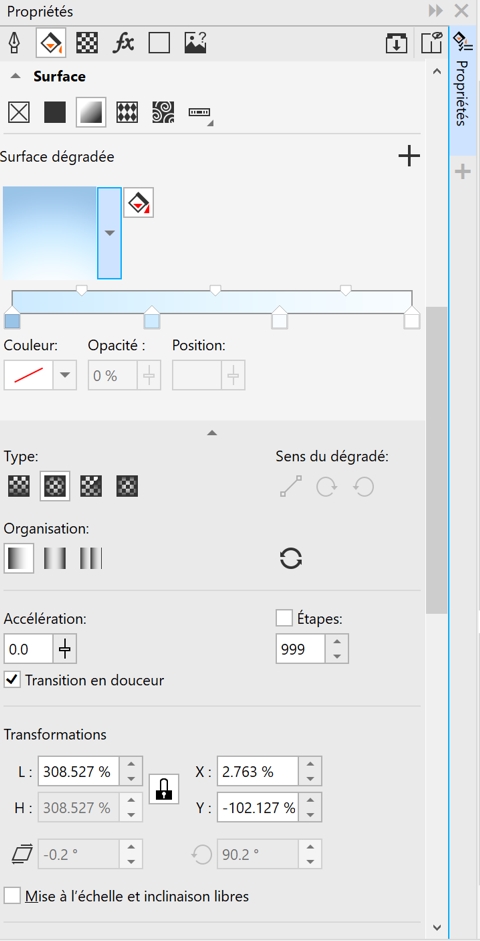 Sélectionnez les deux nœuds ou le point médian entre eux, dans la zone Surface du menu fixe Propriétés, et choisissez une option de direction de dégradé :