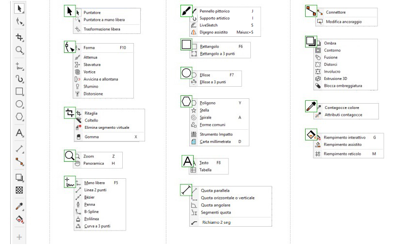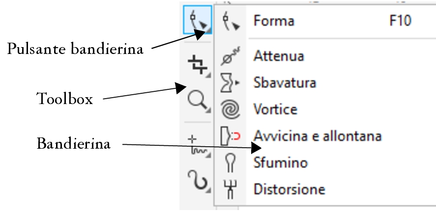 Nella seguente figura vengono visualizzate tutte le bandierine nella casella degli strumenti CorelDRAW predefinita. Inoltre, consente di individuare gli strumenti più facilmente.